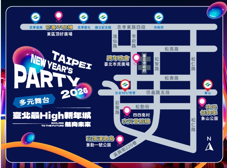 | 4 大多元舞台 | 12/31 21:00–1/1 00:30 | 東區頂好/景勤一號/象山/四四南村 | 電音、民歌、R&B、動漫DJ 四種風格任選 (台北市政府) |